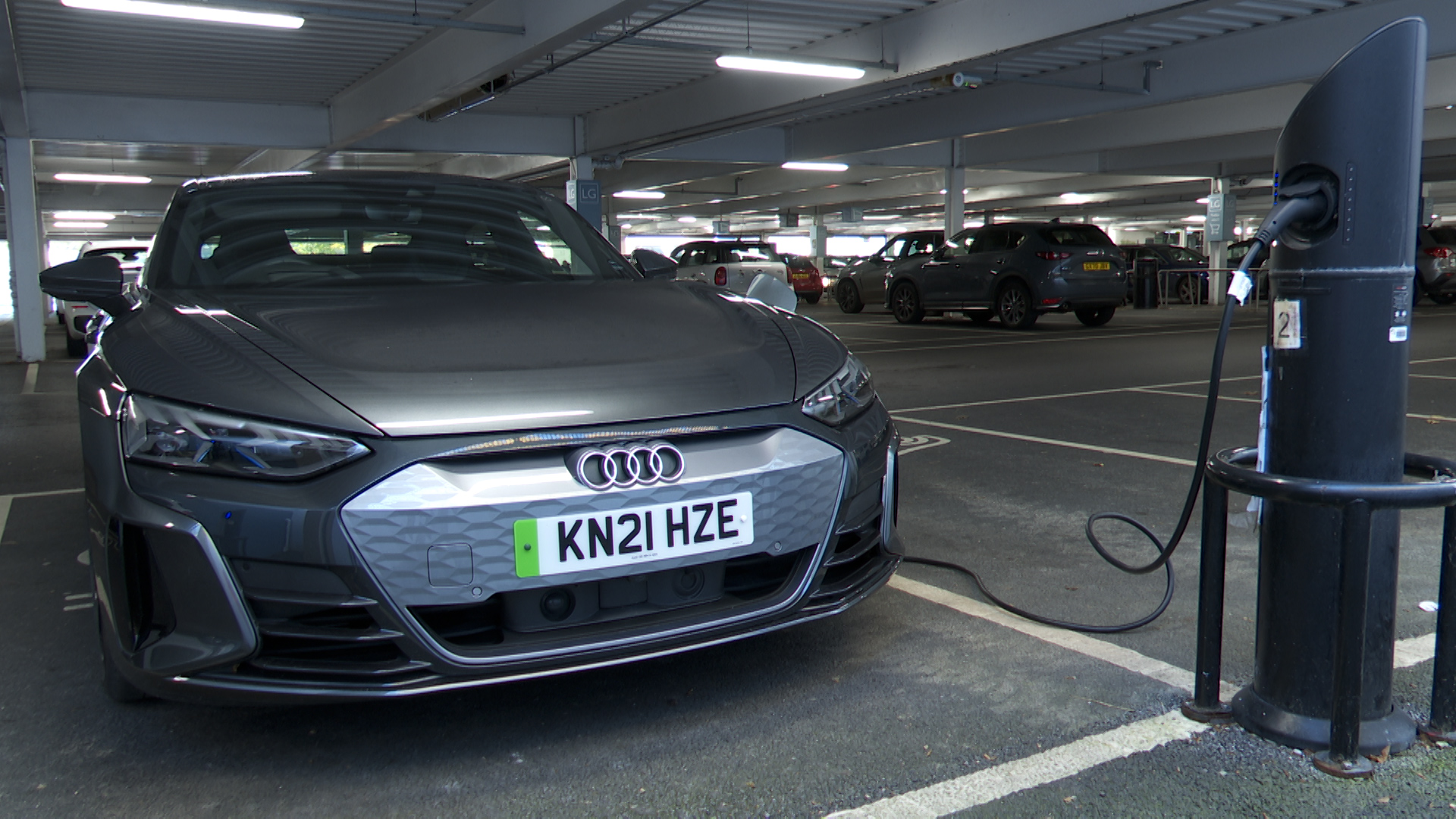 You're looking at thirteen and a half hours if you power up this e-tron GT from a conventional garage wallbox.