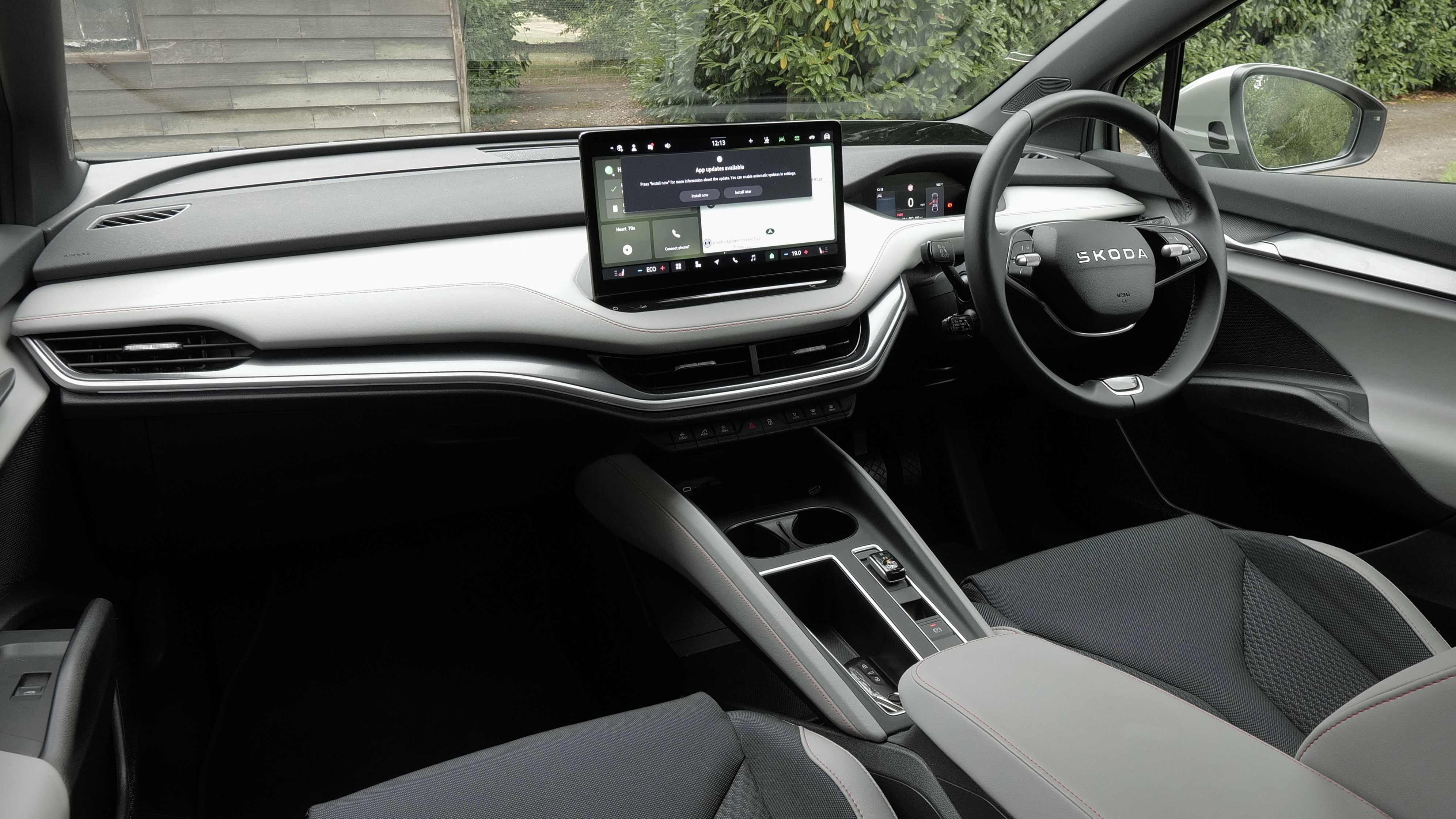 Wheel sizes are quite big - 19 to 21-inches. Inside up-front, it's very like an Enyaq, with a stubby gear selector and a tiny instrument binnacle viewed through a flat-bottomed steering wheel.